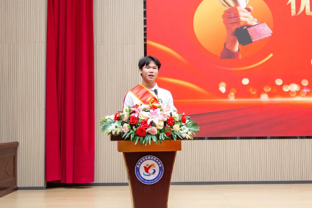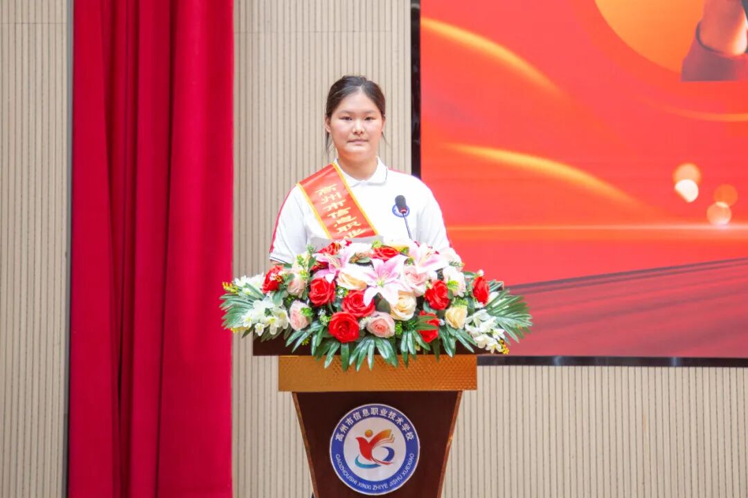 曾文佳执行校长在致辞中回顾了学校近年来在职教高考、深化产教融合、推进素质教育方面取得的突破,展现了职业教育的广阔前景,并强调:“职业教育的核心是培养德技并修的人才。优秀毕业生们用行动证明,只要脚踏实地、勇于追梦,中职学生同样能在广阔天地中绽放光彩。”
