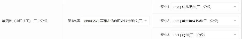 △填报页面(第四批) 一、报读三二分段班的同学 请在第一志愿填写“高州市信息职业技术学校”,代码:8800657。然后选择意向专业。