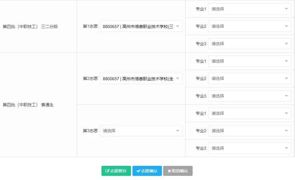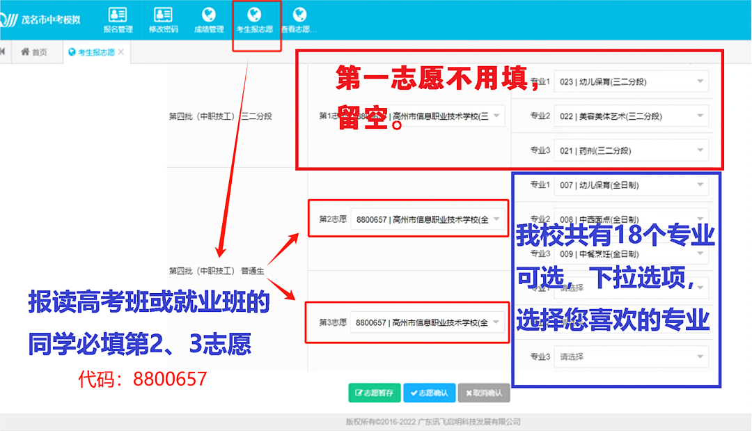 二、报读“3+证书”高考班、双证就业班的同学 请第一志愿留空,在第二、第三志愿填写“高州市信息职业技术学校”,代码:8800657。然后选择意向专业。