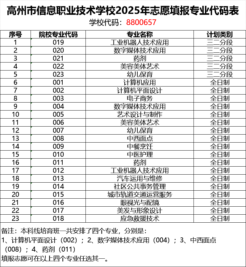 三、报读“3+证书”本科线培育班的同学 请在第二志愿填写“高州市信息职业技术学校”,代码:8800657。 专业填写栏从以下 4 个专业中选其中一个专业填写: 1、计算机平面设计(专业代码:002); 2、数字媒体技术应用(专业代码:004); 3、中西面点(专业代码:008); 4、药剂(专业代码:011)。