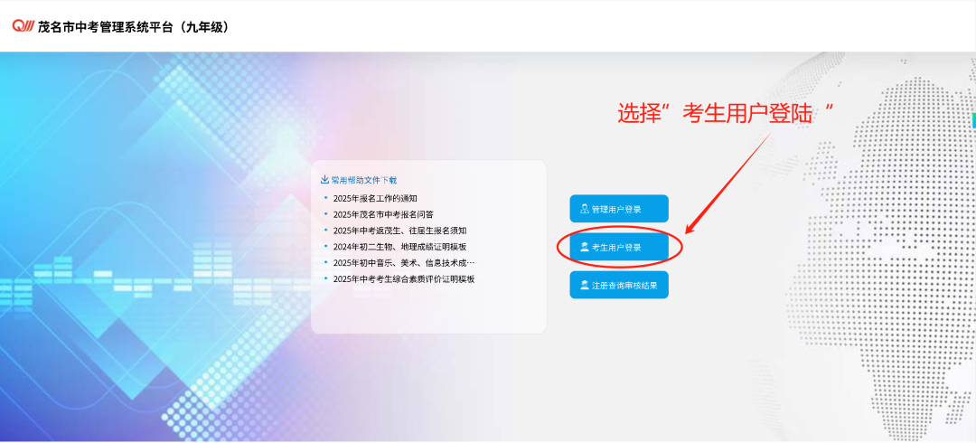 根据茂名市教育局招生政策要求,我校的招生工作纳入“茂名市中考招生平台”统一录取,请考生和家长重视志愿填报工作,考生须于6月10日至12日期间完成网上志愿填报,各学校将于6月13日统一打印志愿确认表,并由考生及家长签字确认。请广大考生注意,逾期将不再接受补报。欢迎广大同学踊跃报读高州市信息职业技术学校(志愿代码:8800657)。 我校各专业安排在第四批次录取,其中第一志愿为三二分段专业,第二至第三志愿为全日制普通专业。具体填报指引如下(已报名的同学也需要填写): 一、考生登录“中考管理平台” “茂名市中考管理平台(九年级)” (点击网址进入:http://www.mmjynet.com:9000/zk) 注:登录系统的考生号和密码均与报名时使用的相同。